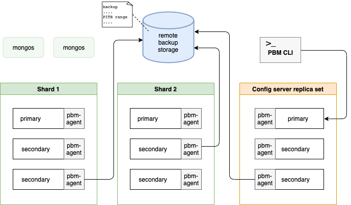 In sharded clusters, one of the pbm-agent processes for every shard and the config server replica set writes backup snapshots into the remote backup storage directly. For logical backups, pbm-agents also write oplog slices. To learn more about oplog slicing, see Point-in-Time Recovery.